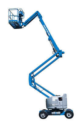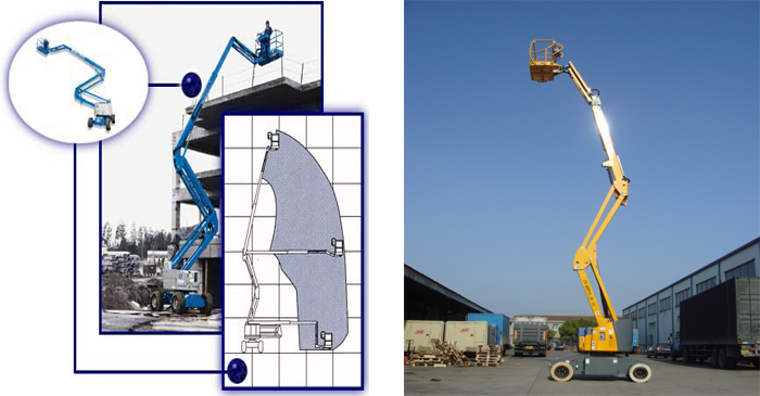 上圖為自行曲臂式升降平臺,升降機的結構展示圖。其采用了機電液一體化、可靠性設計和計算機輔助設計等技術,是一種全液壓驅動、自行式專用底盤突破了以往國內高空作業(yè)升降機只能采用汽車或起重機底盤改裝設計的限制。帶載行駛、作業(yè)穩(wěn)定性好。底盤結構突破了傳統(tǒng)的設計理論和方法,通過優(yōu)化上車平臺總體布局與載荷分布,減少了重心偏移。采用獨特的大角度后仰式鉸點結構,合理設置多種配重模塊,有效地平衡了工作力矩。采用H型變截面復合箱梁剮性車架和高負荷橡膠輪胎,增加了底盤整體剛度,保證了整機行駛、作業(yè)過程的穩(wěn)定性實現(xiàn)了高空作業(yè)升降機帶載行駛的功能。通過大臂前端托架可以快速安裝舉升裝置或載人平臺,實現(xiàn)物料舉升、起重吊裝和載人高空作業(yè)等功能同時為擴展作業(yè)裝置以及各種工作裝置的快速切換提供了接口。設計的三維旋轉托舉裝置,既能夠自動保持被舉升物料的姿態(tài),又可以實現(xiàn)舉升物料在空間內任意高度、任意位置和任意方向的調整要求,速度控制精確靈敏,微動性能好,滿足了大型洞庫內高空作業(yè)與通風管道安裝的要求。利用柴油機或電瓶驅動,靈活方便,廣泛用于市政、電力、路燈、公路、碼頭、廣告、園林、小區(qū)物業(yè)、廠礦企業(yè)車間等行業(yè)的大范圍升降作業(yè)。